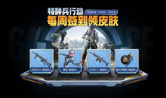 11月5日-12月2日,特种兵们通过个人签到或好友助力可累计签到次数,持续参与活动既可获得MK20-H-星途旅人、套装-星途旅人、SCAR-L-星途旅人和破片手榴弹-星途旅人四大奖励!