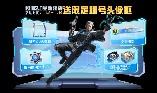 11月5日-11月14日,特种兵们跟随新导师:源代码,探索超体2.0全新升级内容,可获得“成就值” ,累计成就值可获得限定称号:突破极限以及超体2.0头像框,还有超体模式喷涂×4、超体对抗宝箱×2、银河福利碎片×3等丰富的奖励,请各位特种兵留意领取喔~